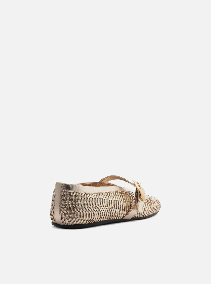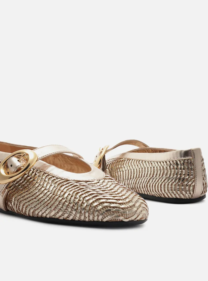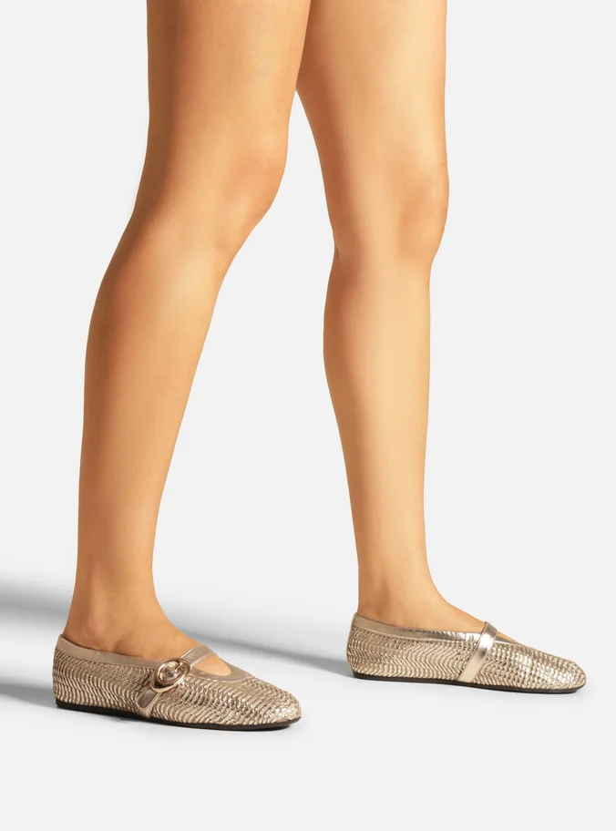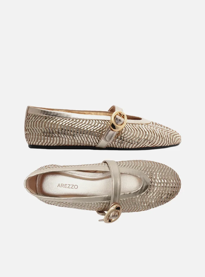 Balerina nga Arezzo, punuar me lëkurë natyrale dhe dizajn të thurur në nuanca elegante ari. Ideale për një stil të rafinuar, luksoz dhe komod gjatë gjithë ditës.